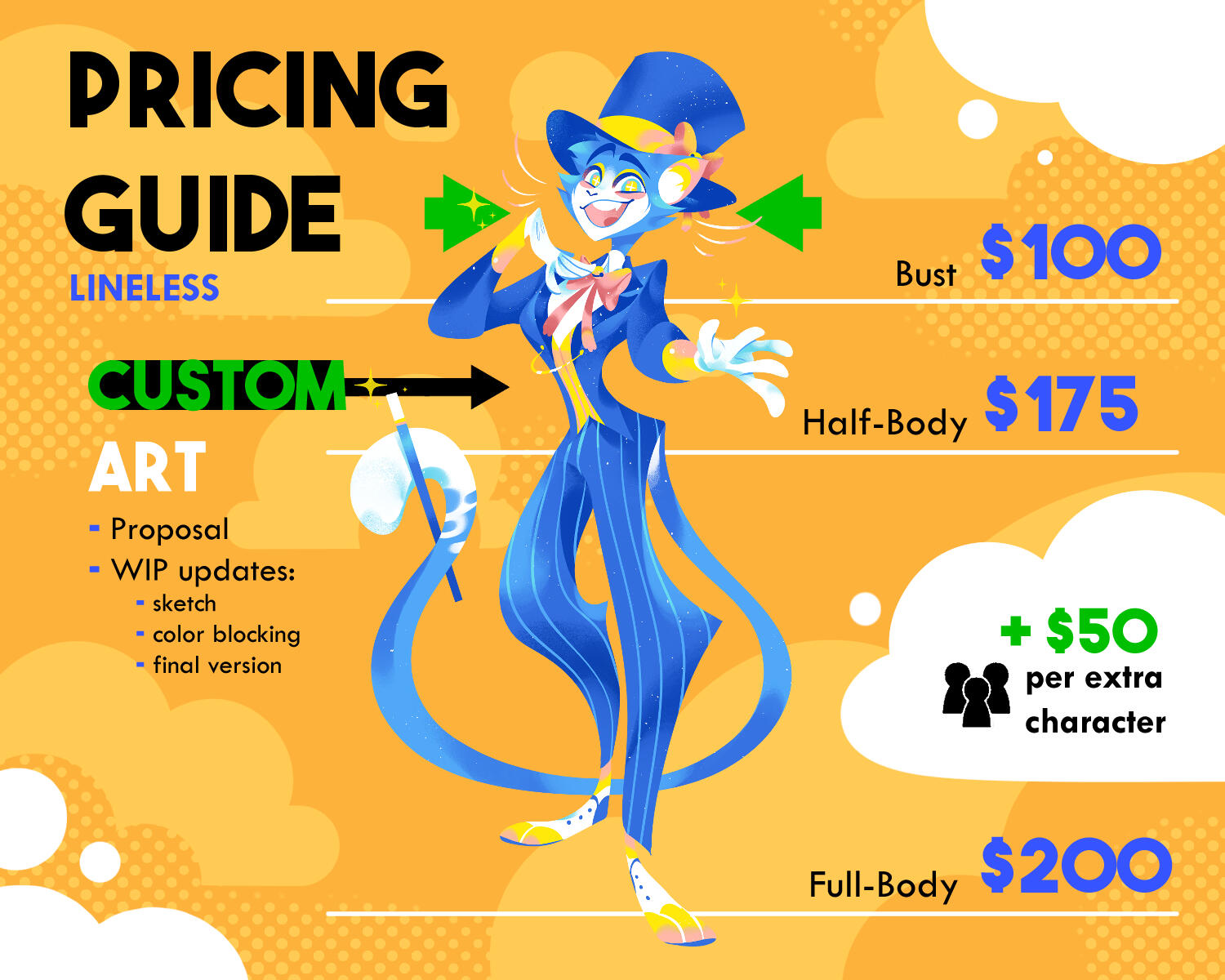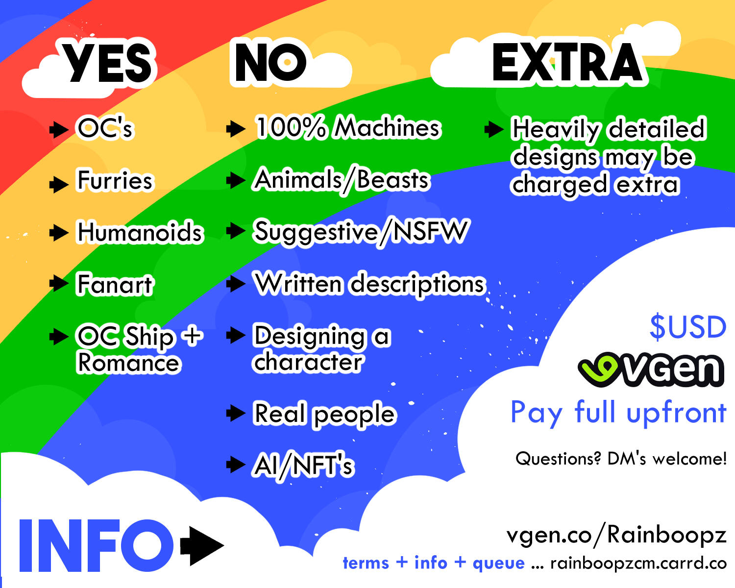 ☁︎ "I" & "me" refers to the artist, Rainboopz. "You" refers to the commissioner. "WIP" refers to Work in Progress artwork. "Skeb" refers to surprise style art.